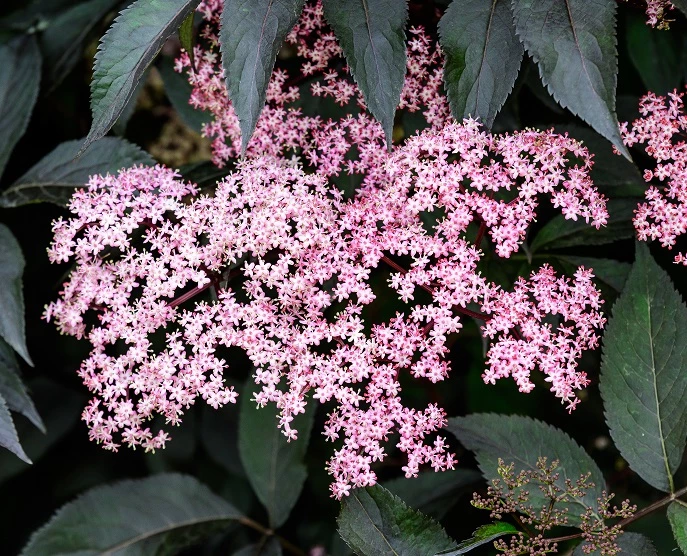 Rotblättriger Holunder mit rosa Blüten und essbaren Früchten.